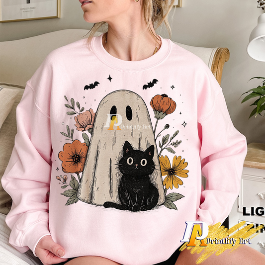 Cute Ghost and Cat Halloween Png, Retro Spooky Floral Design