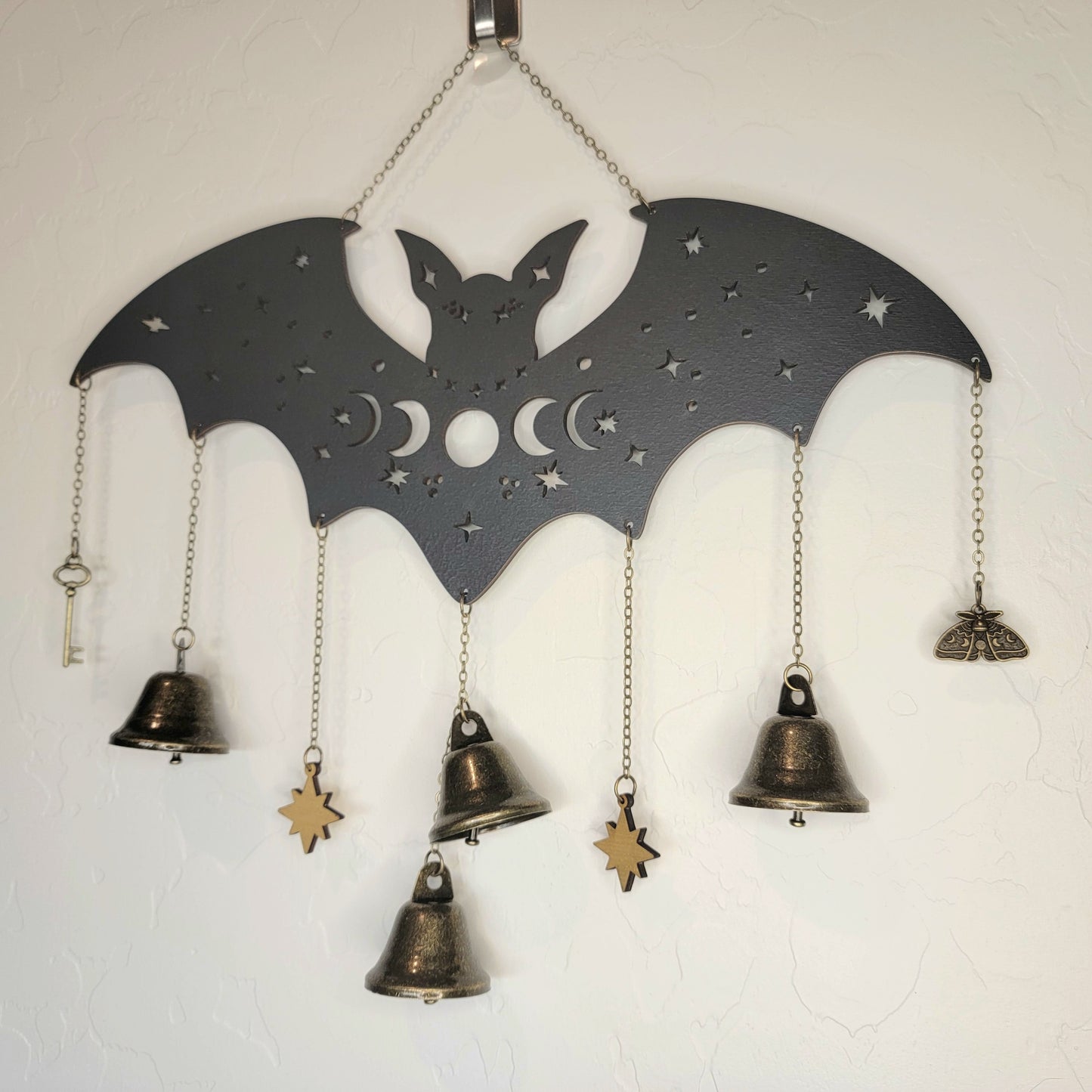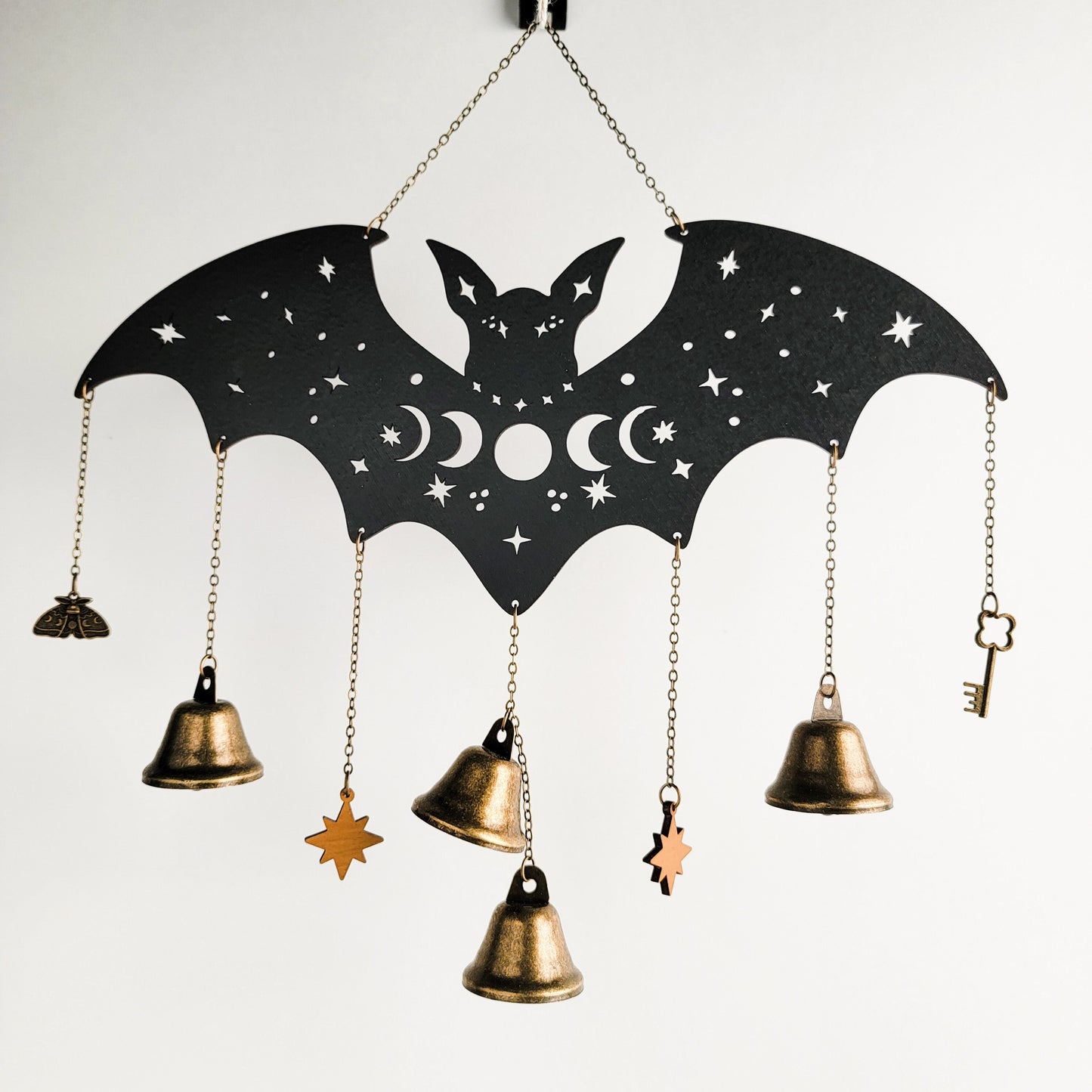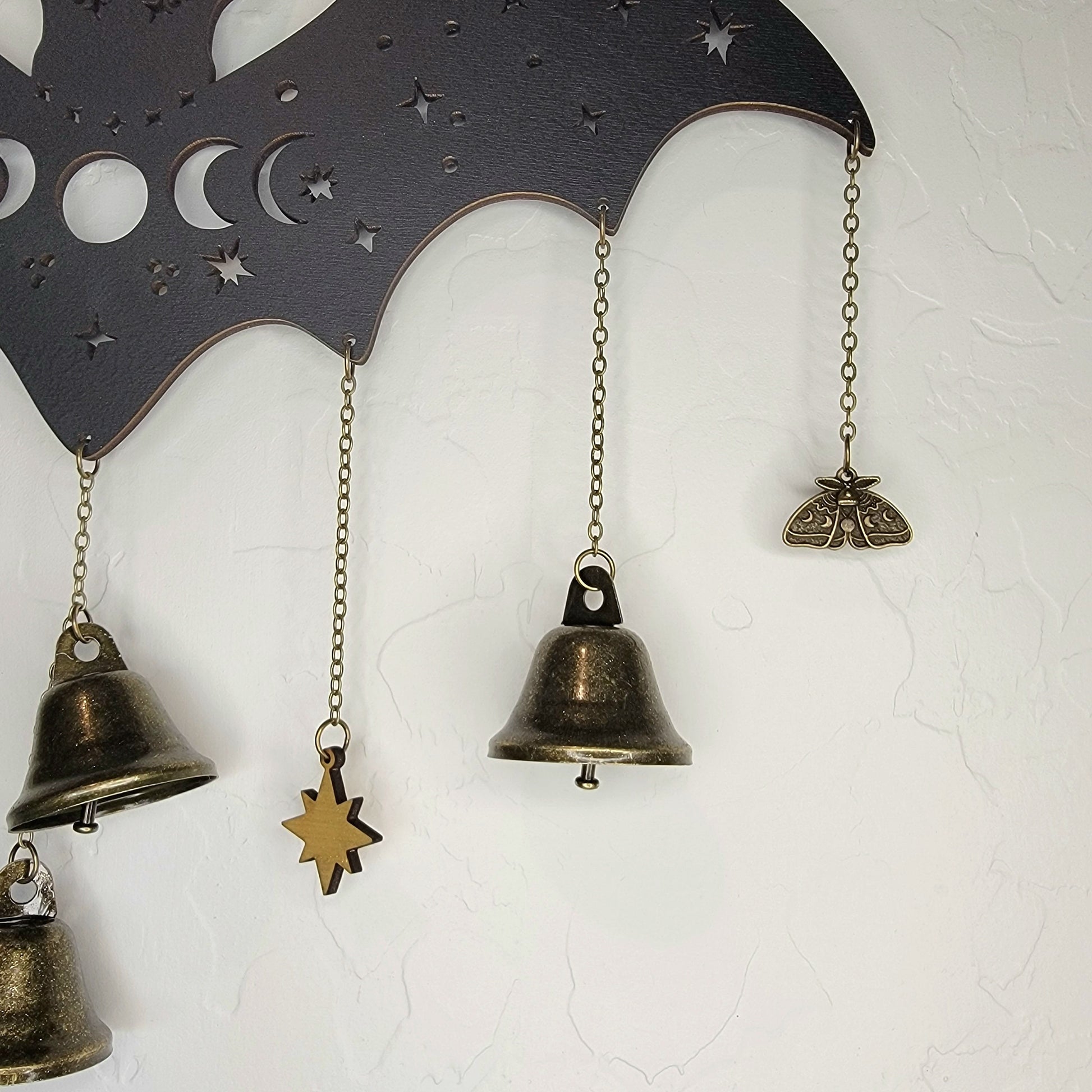Discover the mesmerizing charm of our "Bat Witch's Bells." Crafted meticulously from birch wood, this 1/8-inch thick, 12 inch wide bat silhouette is a testament to detailed artistry. Painted in a bewitching black hue, it features a celestial design laser-cut into its form, allowing light and shadow to play magically with the surroundings. Dangling from our celestial bat are melodious brass bells, a unique brass key (each key is hand-selected and varies, adding a touch of personalized magic), an intricate brass moth, and shimmering gold-painted stars.