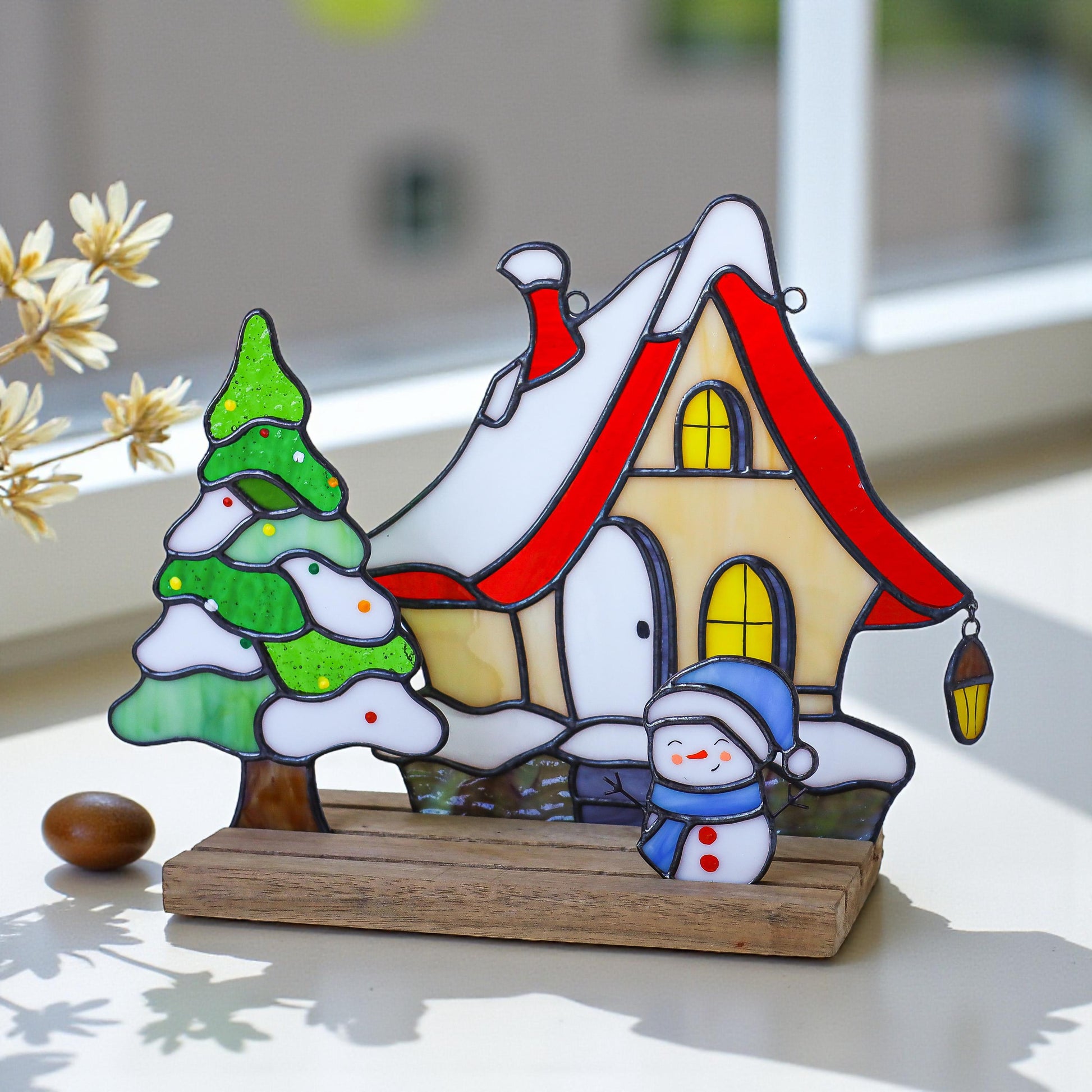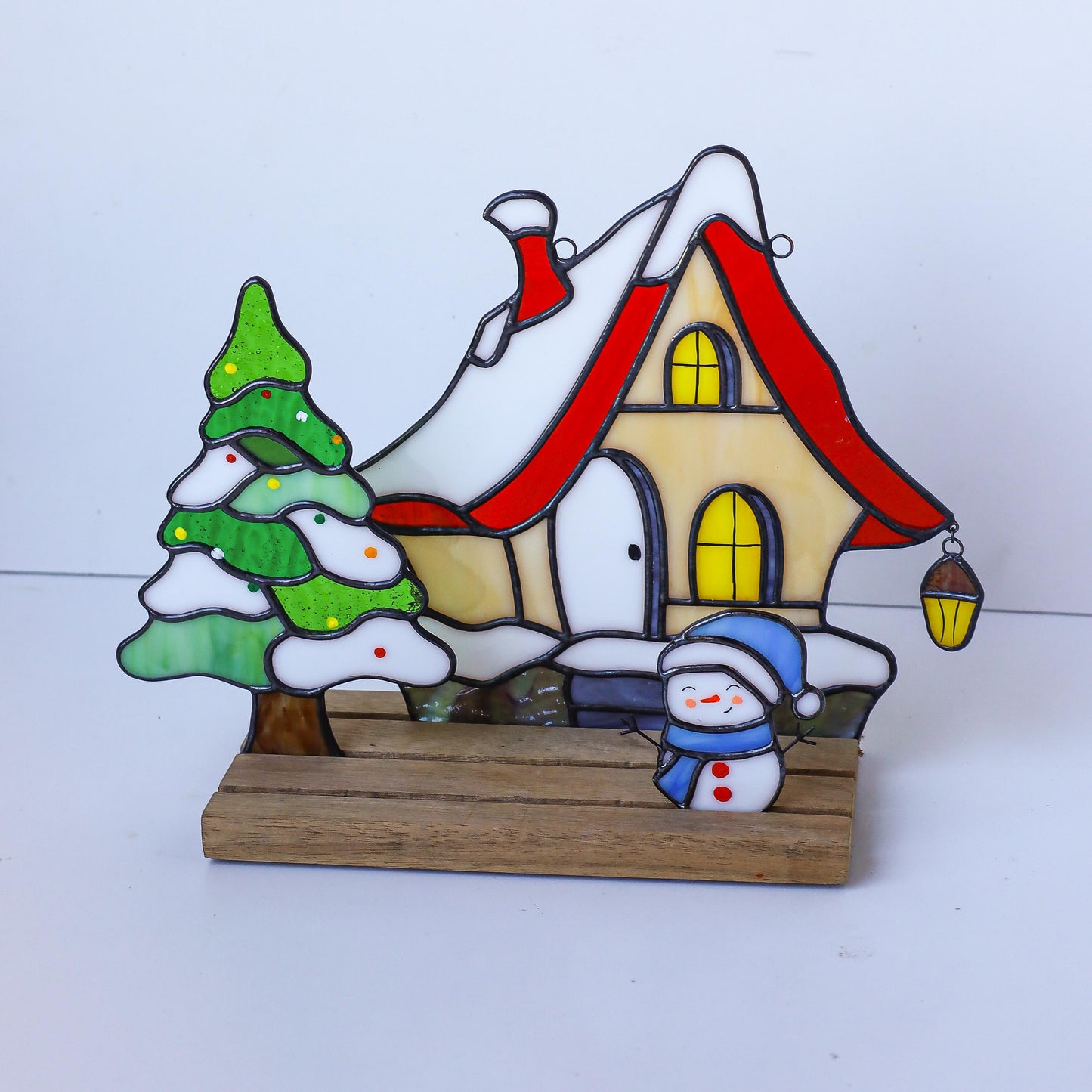 Bring the magic of a snowy Christmas Eve into your home with this enchanting Stained Glass Christmas Village Set. This handmade holiday scene features a cozy snow-covered cottage, a cheerful snowman, and a decorated Christmas tree, all resting securely on a rustic wooden base.