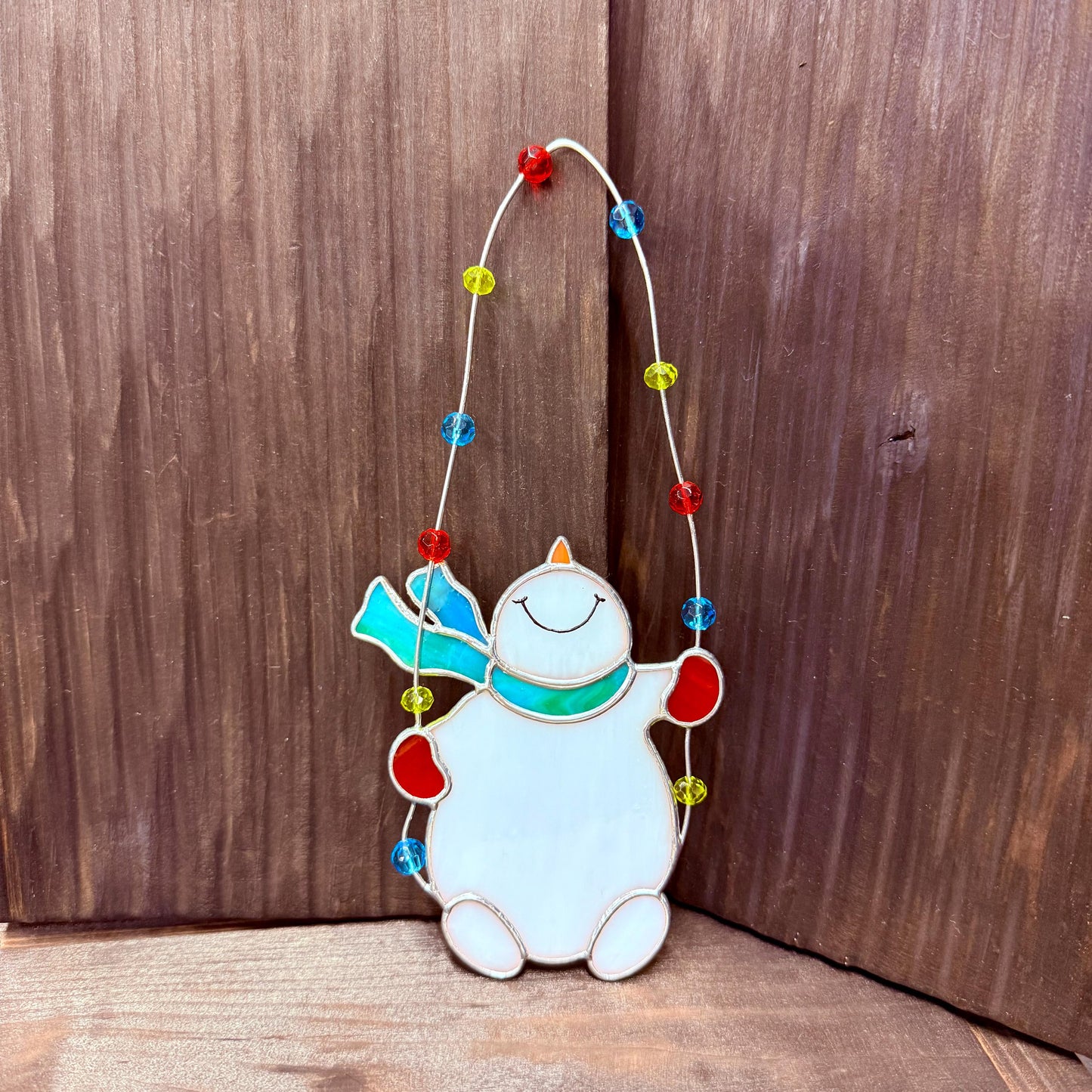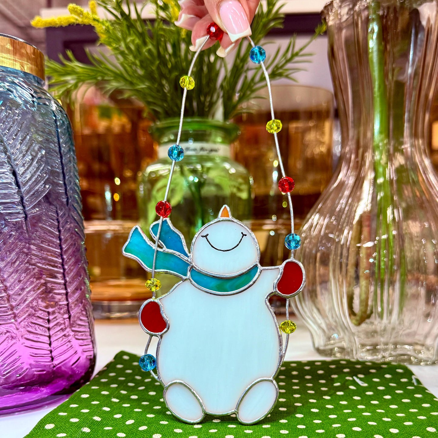 Bring joy to your holiday season with this delightful stained glass snowman Christmas tree ornament. Handcrafted with precision, this cheerful snowman features a radiant white glass body, a charming green scarf, and vibrant red mittens, all beautifully accented by colorful beaded garlands. Designed to catch the light, this festive decoration adds warmth and sparkle to your tree or holiday display.